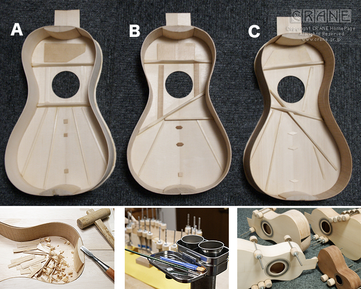 ・ブリッジ:CRANEオリジナルデザイン 黒染ペアウッド、弦穴2段による弦高多段調整可能、アラベスクは黒檀の薄板
