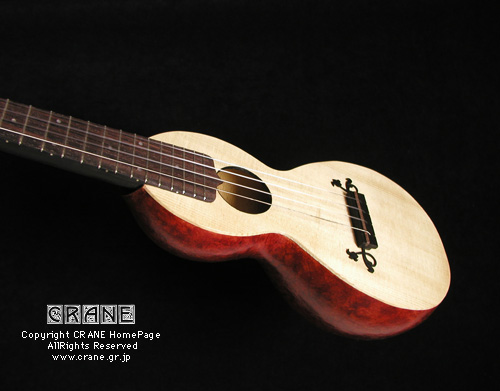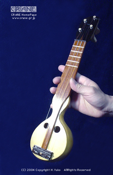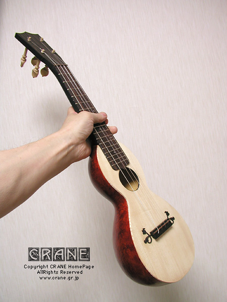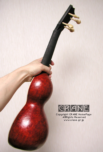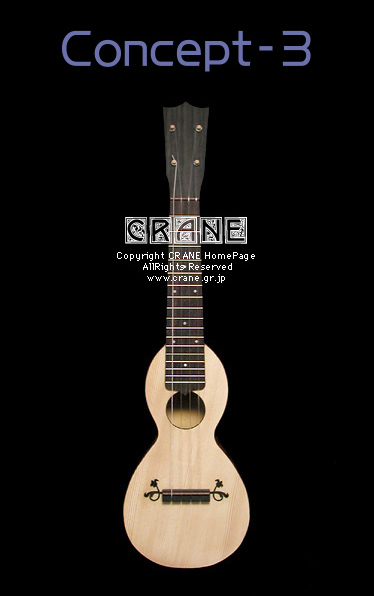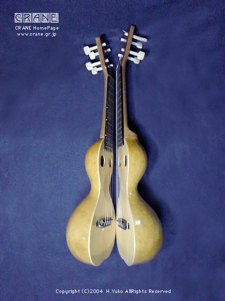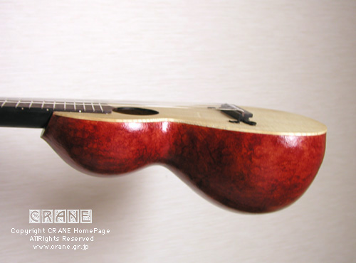 さて....... 2004年の「Concept-3」を御紹介しましょう。毎年へんてこなコンセプトを真剣にとりくんでいますが、今回はウクレレです。小型楽器という意味では Concept-1 や Concept-2 にも通じるところがあります。そもそもヒョウタンは打楽器などでは一般的に知られていましたし、アメリカのバンジョーにも例があります。歴史的にみると西アジア〜アラブにかけてヒョウタンを用いた似通った弦楽器も見られるようです。ただ、基本的に丸い実のカタチが多いようで、日本のくびれのあるヒョウタンはモンゴルから中国界隈でみかけます(西洋にもあるんでしょうかね?)。リュートはボウル状にリブを組んで作られることはもう皆さん御存知と思いますがサウンドの魅力のみならず強度的にみても優れた構造といえます。押しつぶそうとしても多少のことではビクともしません。ウソだと思ったら御自分の楽器をふんづけてみてください。20世紀や21世紀の現在でもウードの仲間や一部のギターにクビレをもつボウル・ボディの製作例があります。う〜〜ん、やはりこういった形状のボディは気になる人は気になるってコトでしょうね..... 。私の楽器データベースにはいくつもこういったヘンテコ楽器を見つけることができますが、百年以上も昔からヒョウタン型のボディの弦楽器はいくつも作られていました。