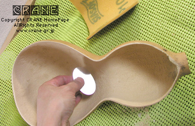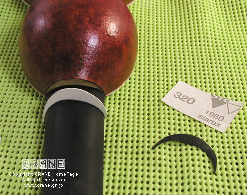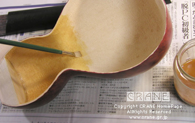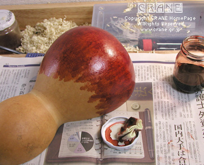 それで...... いろんな方から当クレーンにお問い合わせのメールがあったのが「内部の処理をどうするか?」 という点です。そのままでもかまわないと思いますが私はセラックで塗装しました。ヒョウタンの内壁は以外ともろく、ウレタンのような柔らかさです。のちに気候の変化で劣化することも考えての判断です。