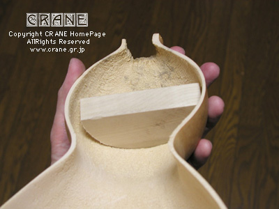 非常に良く乾いており、たたくとコン!コン!と軽い音がします。 肉厚とはいえガサガサした内部を多少はならしておくためにスクレーパをかけました。案外もろい内部です。まぁ、無理に内部を削ることもありません、ほとんど手をかけなくともカットしたままで使えます...... 。注意すべきは作業中にボディを強くつかまないことです。表面板を付けていないボディはたわみに弱いのでグッと力任せにつかむと亀裂を生じる恐れがあります。