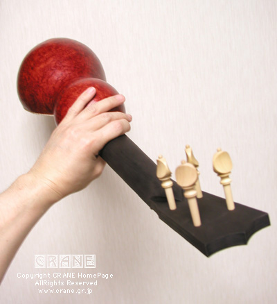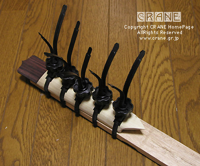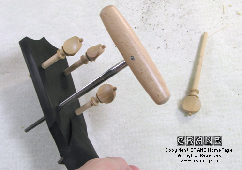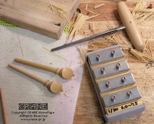 今度は糸巻きです。今回使用する糸巻きは私のオリジナルデザインによる汎用ペグで特注品。そう、インド洋にマグロを追ってようやく捕らえたペグメーカー「Radharam Sohanlal」だ! 私がこのクレーンホームページで紹介したら、あっ、というまに日本をはじめとする世界の製作家が群がってきたとRadharam氏がメールをくれました。その後、古楽器系の問い合わせも多いのでカタログモドキを作りたいとの相談...... う〜〜ん、でもねぇ、時代や製作家によってペグのスタイルも様々なのよ......... と、いうことで説明してあげて、数十種類を教えてあげたのですが、そのうちいくつかはカタログモドキに現在掲載しているようです。もっと体系的にサンプルもたくさん作って本格的にやればいいのにねぇ..... 。