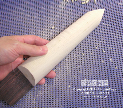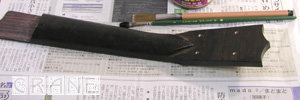お次はネック側です。ブロックとネックの接続方法もいくつか考えられますが、まぁ、CRANE ですから18〜19世紀風にいきましょう(あっさり)。となるとヘッドとネックもそれにならえば迷うことなく作業もはかどります。