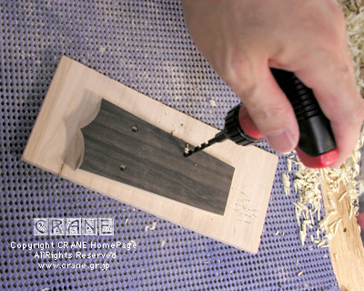 ネックとヘッドを接着してからでもかまいませんがペグ穴を空けておきましょうか。私はこの作業はいつもハンドドリル。電動のボール盤はトンとゴブサタしています...... 考えてみると近年はなんでも手作業でやっていることに気づきます。
