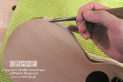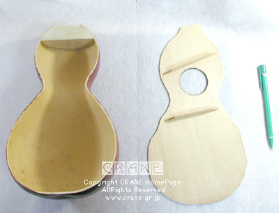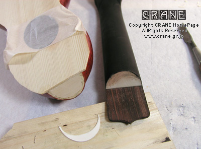 今のうちに表面板をボディにフィットさせておきましょう。飲み、おっと、ノミがボウルのボディを削らないように、わずかにボデイよりも大きめにはみ出してもかまいません。こういう楽器では神経質にムリヤリピッタリ合わせようとしないほうが結果的にうまくいきます。