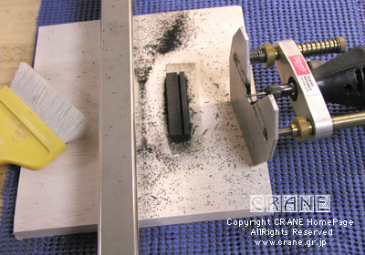 はい! いつものドレメルのルータです。ハイパワーとはいえ、一気に彫り込んではイケマセン。1mm程度の浅い溝を数回に分けて彫り、そのつど深さと溝の状態(直進性など)をチェックしながら作業します。あとでサドルがこの溝にキッチリ納まるように彫らねばなりません。ちなみにルータをマグロと並行に移動させるには写真にあるようにスチールの角材を両面テープで台座に貼り付けておき、それにルータのジグを沿わせます