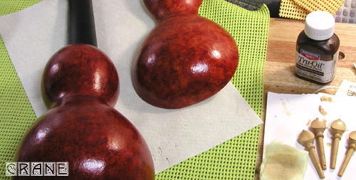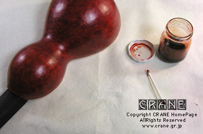 ネックの染め作業の合間にボディの染めと塗装です。じつは......... いつぞやの Concept-2 の配合セラックをとってあったのだ! ワハハハハ! 赤茶色に配合したセラックでポンポンとタタキながら塗ります。もともとヒョウタンの表面はツルツルではなくこまかい起伏でデコボコなんですね。ここでは染めるのが主な目的なのであとからオーバーコート用に塗料を重ねます。