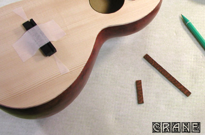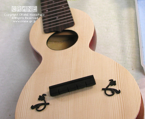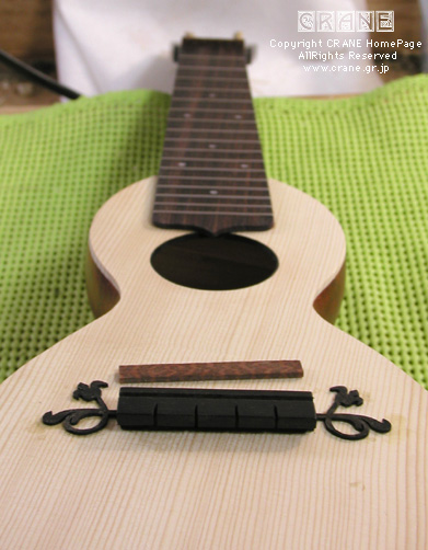ニカワを使ってブリッジを接着します。やはりブリッジ接着はニカワです。なんだかブリッジ周りが寂しいので18世紀〜19世紀風の唐草模様を入れます。これは当サイトではおなじみの黒檀薄板を糸鋸でセッセと切り出したもの。厚さは約1mmなので厚い部類ですが、なかなかオシャレでしょう? じつはコレ、G.B.Fabricatore 1806年ギターのアラベスクの一部なんです。