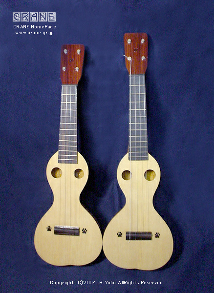 ヒョウタン・ウクレレの3・4号機は、ぬわんと肉球装飾付き! 弦長の異なる2つの双子モキチUke ですな。このブリッジ両脇の肉球装飾はちゃんと黒檀の薄板を彫刻刀で削って作ったとのことですよ。なんてかわいらしいんでしょう。しかも1個のヒョウタンを真っ二つにして2本の楽器を製作されているのでピッタリ・パッカリ合致します。これはYukoさんの立派なオリジナル・コンセプト・モデルですね。