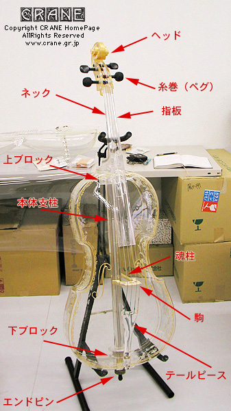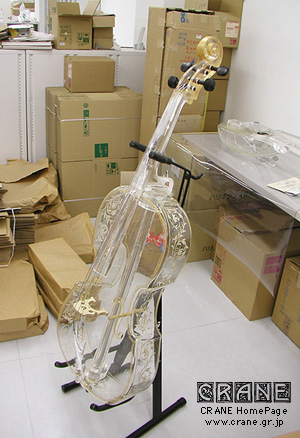 ● はい! 耐熱ガラスのチェロです。写真を御覧あれ。 え? 周囲の段ボール箱がエレガントじゃないって? ここは展示場ではないのでやむおえません。開発の現場というのはたいていこうやって修羅場であったりするものです。綺麗に片づいている工房のほうが珍しいのです。工房クレーンはどうかって? ウチは狭いから作業のたびに片付けないと作業できんのです、広い工房になったら一気に散らかるかな? 写真がやや暗いのは適性露出で撮影しようとすると楽器が透けてしまって写らないから(笑)。マニュアル撮影でアンダー傾向にて今回は撮影してます。