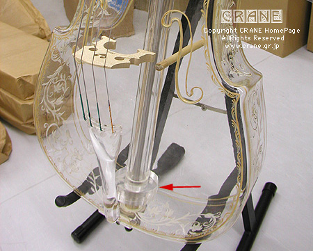 ・エンドピン:エンドピンも脱着が可能。つまりこの楽器では吹きガラス本体以外の全てのパーツが交換できるわけです。仮に本体がガチャ〜ン!と割れてもスペアボディと交換できます。但しこのチェロの価格は開発費が結構かかっていて1600万円だそうですけど.....。