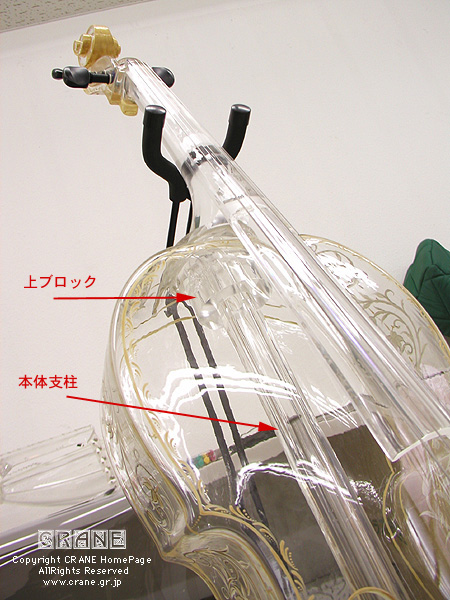 ・下ブロック:一般のヴィオル族やギター族の下ブロックと違ってリブに密着しておらずむしろ本体支柱の一部。