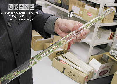 私もこのハリオグラス御自慢のガラスのチェロをちょっと弾かせてもらいました(弾くというより触ったという程度)。約11kgという重量はさすがにズッシリ。慣れない手つきで弓を手にしてボウイング777です。思ったより鳴ります。以前兵庫の古楽器製作家の平山氏がクレーン工房にいらしたときに彼の作によるガンバを鳴らしたことがあって「擦弦楽器のなんとパワフルなことか」と思い知ったものですが、このガラスのチェロは木の楽器ほどではありませんが以外に音量があります(公的な演奏ではヴァイオリンもチェロもアンプで増幅されています)。特徴的なのは音全体が硬いことでしょうか。ガラスという比重の高い素材で作った楽器ですから共振点も高く、その音質はユニークにして宿命ともいえます。木のチェロとは別世界です。イコライザで補正すれば面白いかもしれません。ハリオグラス社では現時点では2挺のチェロを保有してコンサートでは必ずその2挺を準備するのだそうです。ガラスのヴァイオリンもそうですが万が一破損したときの保険というか予備機ですね。