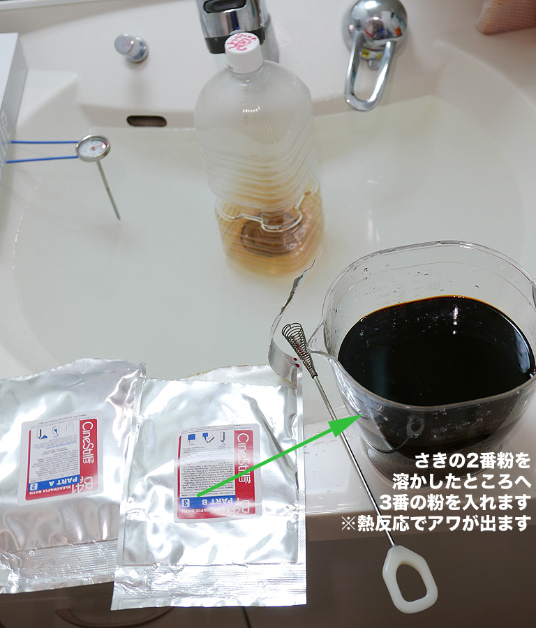 そこへ3番の粉を入れてかるくかき混ぜます。すると茶色になり熱反応を起こしてプクプクとアワが5分ほど出ます。