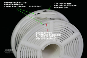 巻き癖の強いフィルムやデッドストックのフィルムなどはリールに入れづらいので、いったん他の軸に巻き上げてフィルムの反対側の端から入れるとうまくいきます。