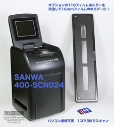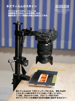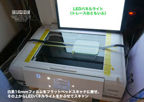 ボール紙の手作りマスクを貼って16mmの110判、35mmライカ判、ブローニー判まで幅広く高画質でネガスキャンできます。