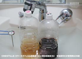 漂白定着液は元々暗い色のせいか、何回使っても色にはあまり変化がありませんが、しっかりシゴトはします。私は使い続けた現像液を秋から冬にかけて室内に常温保管していましたが、 3ヶ月経過しても現像時間を少し延ばしたり温度を上げたりして工夫することで、現像できました。