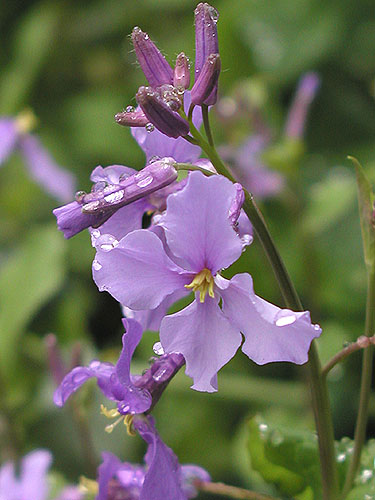 ● 2002年4月:だいぶカメラに慣れてきました。近所の栗畑に咲いていた「ショカツサイ」の花を撮影してみました。別名「花ダイコン」とか「ムラサキハナナ」といい中国原産で昭和初期に日本へ広まったとのことです。その昔、三国志でおなじみの諸葛公明が侵攻した土地に食糧として植えたのがはじまりとか....。この日は3月中旬にしては暖かく、桜も満開。しかし小雨の中での撮影でありました。ズームレンズで引いて撮影するとレンズの収差によりプリズム状のにじみが出ます(空と樹木のコントラストの高い部分など)。