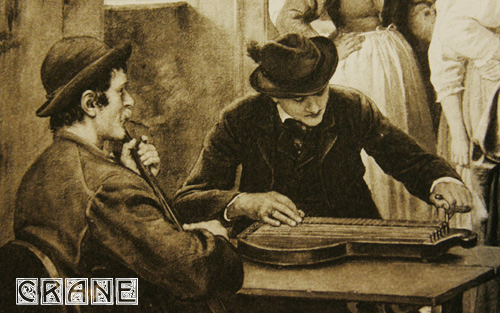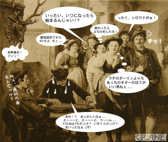 テレビやゲーム機やインターネットの無かった時代。こういった集いの場は現代の私たちが想像するよりずっと貴重な時間だったのかもしれません。アコガレの相手と手を取り合って踊る。きっと出会いの場でもあったのでしょう。皆さん楽しそうじゃありませんか....... ん? でもよく観察すると踊り手の皆さんは早く始めたくてウズウズしているようにも見えます。版画をよく御覧ください。店内のほぼ全ての人の視線を集めているのはツィター奏者であり、彼自身もどうやら必死に調弦を終えようと努力しているようです...... 。