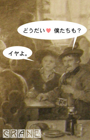 表題のとおり期待と緊張が感じられ、まさに今ダンスが始まろうとしている空気を感じますね。ギターは調弦も終わって準備オッケー。相棒のチター奏者は右手でプレクトラムを使って弦をはじきながら左手のレンチで巻き上げて調弦している最中です。楽器や人物のデッサンもなかなかのもので、服のヨレ具合や人々の視線、ポーズなども表情豊かに描かれています。左から光が射していますが、実際にはかなり暗いと思われる右奥の店内の様子までトーンを落とさず巧みな描写です。