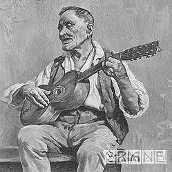 タイトルにしてはどこか悲しげな奏者..... 聴き入る少女。ストーリーを感じますね。この老人、かつてギターを友として諸国をめぐり、数々の感動と伝説を世に残した名手であったに違いありません。栄光と影、成功と失望。そののち彼は現役を退き、余生をおくるべく故郷イタリアに帰郷....... やがて日ごとに衰えゆく身体.......