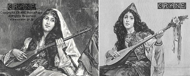 女性が楽器を弾くという、いかにもわたくし好みのテーマですが、今回も同じくサズを奏でる女性です。注意深く観察すると前々回の作品でサズを弾いていた女性とほとんど同じ姿勢であることに気づくでしょう。前回、サム・アウトサイド奏法か?なんて書きましたが、よく見るとそうでもなく、手首の角度と楽器の傾斜で微妙な右手ポジションを保持しているようです。いずれも付け爪らしきものは見あたらず、プレクトラム(ピック)も用いていないようです。今回の女性が弾いているサズには表面版上にエクステンションのフレットが接着されていることに気づきます。以外とテクニカルでドラマチックな演奏をしていたのかもしれません。