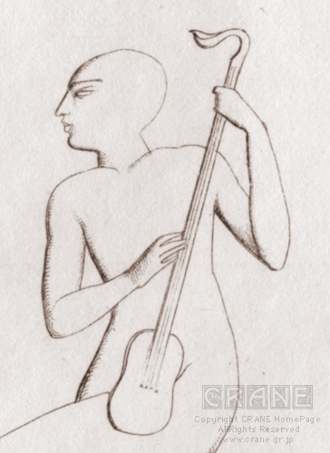 エジプトのハープ:エジプトではすでに紀元前2700年頃には数本の弦を張ったハープが使われていたようですが、紀元前10世紀頃から、さらに多弦のハープが当時の板絵などに登場しています。この版画に登場しているハープは数えてみたら22本の弦があります。