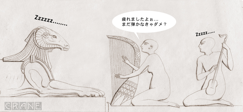 下段は馬の頭を持つスフィンクスでしょうか。その前で弦楽器の演奏が描かれています。お食事のあとの優雅な昼下がりといったところでしょうか。ハープの奏者はなにやらビクビクしながら弾いているようなので、演奏を怠けたらスフィンクスに喰われるのかもしれません。