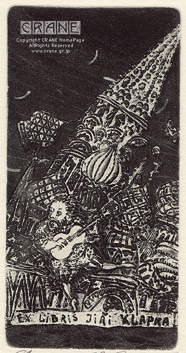 この版画の作家はGennady Aleksandrovさん。JiAi KLAPKA さんのために制作された蔵書票スタイルの銅版画(エッチング)です。表題は私が勝手に付けたものですが、他に適切なタイトルがおもいあたりません。嵐のなか髪を振り乱しギターを弾きながら果敢に立ち向かう男性が生き生きと描かれています。見方によっては舞っているようにも見えますね。つま先で立って片足をピョコンと跳ねて、なんとも愉快なポーズ。ふんばっていないところが良いのです。完全に脱力して立ち向かってますな。力強いタッチでリズム感のある構成。塔は大きく傾き、いまにも吹き飛んでしまいそうです!