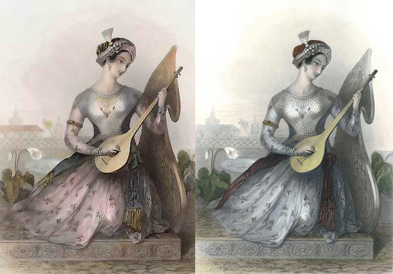 女性の衣装や背景の建築物の様式から安易に想像するとインドあたりでしょうね。サズのようにも見えます。表題は直訳すると「インドの国王の娘」ってトコでしょうか。上品な顔立ちの女性が豪華な衣装をまとって湖畔でサズを奏でる、といった様子なのですが、足下を見るとステージのような台座があります。さらに左肩の後には大きな植物の葉をモチーフにしたようなパネルも見受けられますね。背後の花も含めてなんらかの暗示があるのかもしれませんが、詳しいことはよくわかりません。