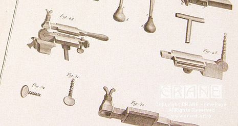 巻弦に関してはGibson社の古いカタログからもわかるように、古来より1920年頃までは、基本的に巻弦の製造は「手作業で芯線に金属線を巻き付けていた」ことが伺えます。また、今回の版画のなかの Fig43,49,50 のようにガット(羊腸)弦を均等な太さに加工するために、鮫革でクランプして弦を回転させて研磨していたことも推察できるでしょう。同様にキャリパーやクランプツールの類が多く見られることから、当時も弦の精度確保に苦労していたことが考えられます。現在、私もときに羊腸から弦を作りますが、今も昔も同じような悩みと工夫があるのだと深く共感します。