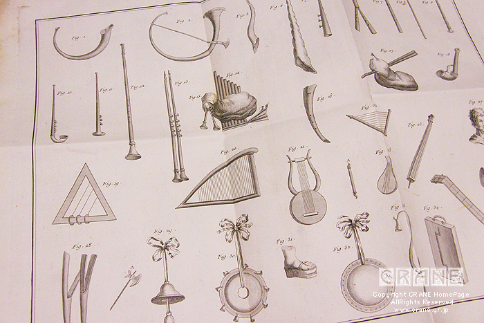 インターネット上で海外の弦楽器の版画に関する情報を集めていると、時々この文献の一部が版画作品として流通していることに気付きます。散逸した文献を元通りの1冊に戻してみようか?と思い立ち、18世紀当時に印刷された断片を地道に私は集めていました。例えばオルガンやハープの紹介されたページ、あるいは管楽器のページなど、いくつかを所有しています。