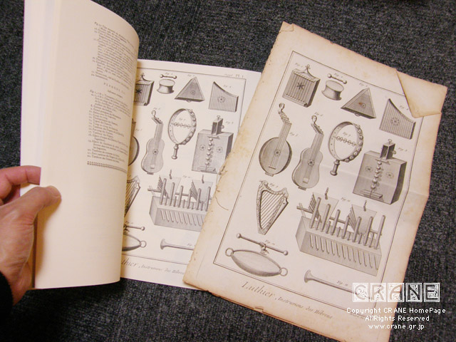 私はその復刻本を2003年にアメリカの学術書専門店から $28.95 で購入しました。フランス語が読めなくとも図鑑として十二分に楽しめる内容です。復刻本はA4サイズより若干大きめのサイズで構成されていますが、オリジナル(当時)の版画による文献はB4程度のサイズであり、楽器によってはおよそB3サイズを折り込んだ大きなページも含まれています。つまり、復刻本はだいぶ縮小印刷されていることがわかります。