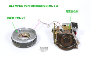 オリンパスペンはそんな自動露出(EE)カメラのひとつで、レンズの周囲にサークルアイと呼ばれるドーナツみたいなセレン素子を備え、ボディ内部にメーター(電流計)があって、その針の振れで露出(いくつものシャッター速度と絞りの組合せ)をコントロールする仕組みです。