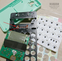 前後のパネルを分離すれば基板が現れます。この電卓には電池も入っていて、それを取り出すとネジがあって、