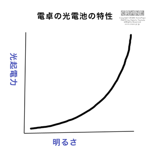 従来のセレンと比べてみると明るさに対して針の振れ方(光起電力)が直線的ではないようです。弓なりの特性に見えます。