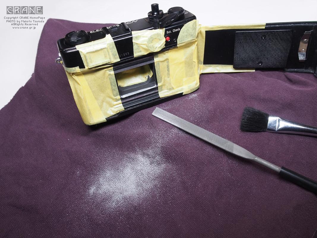 ん? いつもと違ってゼンゼン削れません。よく観たらフレームの厚みが他のカメラの4倍以上あります。上下なのでさらに時間がかかります。