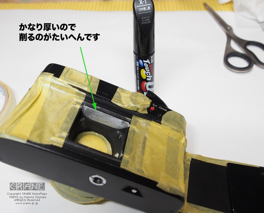 はい、それでようやくレンズ室の露光開口面を削ります。切り子を防ぐためにマスキングしたのち、ひたすらゴシゴシ .... 2時間ぐらい。くれぐれもレンズを突かないように。