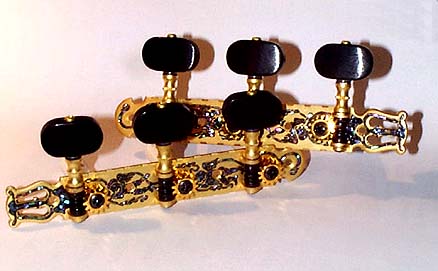輸入楽器の中には粗雑な糸巻きも少なくありません。せっかくボディがよく鳴っても調弦がキモチワルイということはよくありますので、そういうときに交換してみればいいかもしれません。もっとも、リチャード・ブルーネなどは最初からロジャースが付いていますからあえてこれに取り替える必要はないと思います。ロジャースやシャーラーの高級糸巻きはお店だと10万円ぐらい(個人輸入すればもちっと安いけど)で庶民には手が出ませんが、じっつによくできています。ギアの歯車から手作業で切り出しているので職人さんのワザの勝利でしょう。この写真のモデル自体は装飾以外は機械加工された量産ものですからズバ抜けて巻き上げ精度が高いというわけではありません。