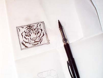 ● まず、写真やイラスト(あるいは市販の年賀状カット集とか)をもとに、全体のレイアウトを考えます。そしてトレーシングペーパーにサインペンで描きます。