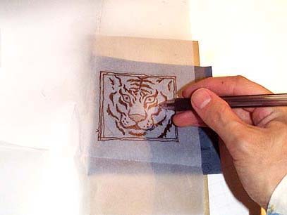 ● 次にカーボン紙を版木にのせ、その上から裏返しにしたイラスト(さっき書いたヤツ)をかぶせます。この上からボールペンでヤサシクなぞってやれば裏版を書き込めることになるのです。