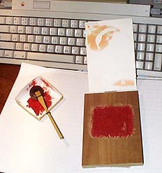 ● 彫り上がったら、試し刷りしてみましょう。ここでは牛乳パックの底の部分を1cmぐらいカットしてインク皿の代わりにしています、まるで主婦のようです。インクはやや多めに出しておくのがコツです、水はほとんど入れないほうがいいです。印刷するまえに版木に古い年賀状を写真のようにガムテープで貼っておくと刷るときにハガキが汚れないので重宝しますよ。