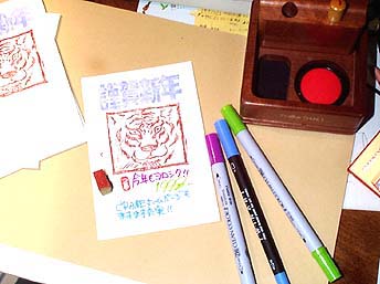 ● あとは宛先を書いてコメントのひとつでも添えれば立派な手作り年賀状の出来上がり!.....でもこれって虎というよりはタチの悪いドラネコみたいですね。あ、そうそう、私は自分の名前のハンコも彫ってありまして、それで最後のサインがわりに使っています(朱肉はそのためのものです)。