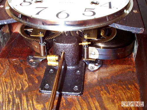 2つのゼンマイが内蔵され、文字盤の穴からゼンマイ軸を巻き上げます。向かって左側が時報のゴング駆動用で、向かって右側が時刻指示の駆動用ゼンマイです。どちらも内側に向かって巻くのが一般的です。私は毎時のゴング音は嫌いではないのですが夜中にトイレに向かうときに鳴るとビックリするので現在のところ左は巻かずに右側のゼンマイだけ巻いてゴングは鳴らないように使っています。振り子はボデイの内部にぶら下がっているので外からは見えませんが、機械装置として考えれば長方形の箱形の柱時計と同じしくみです。