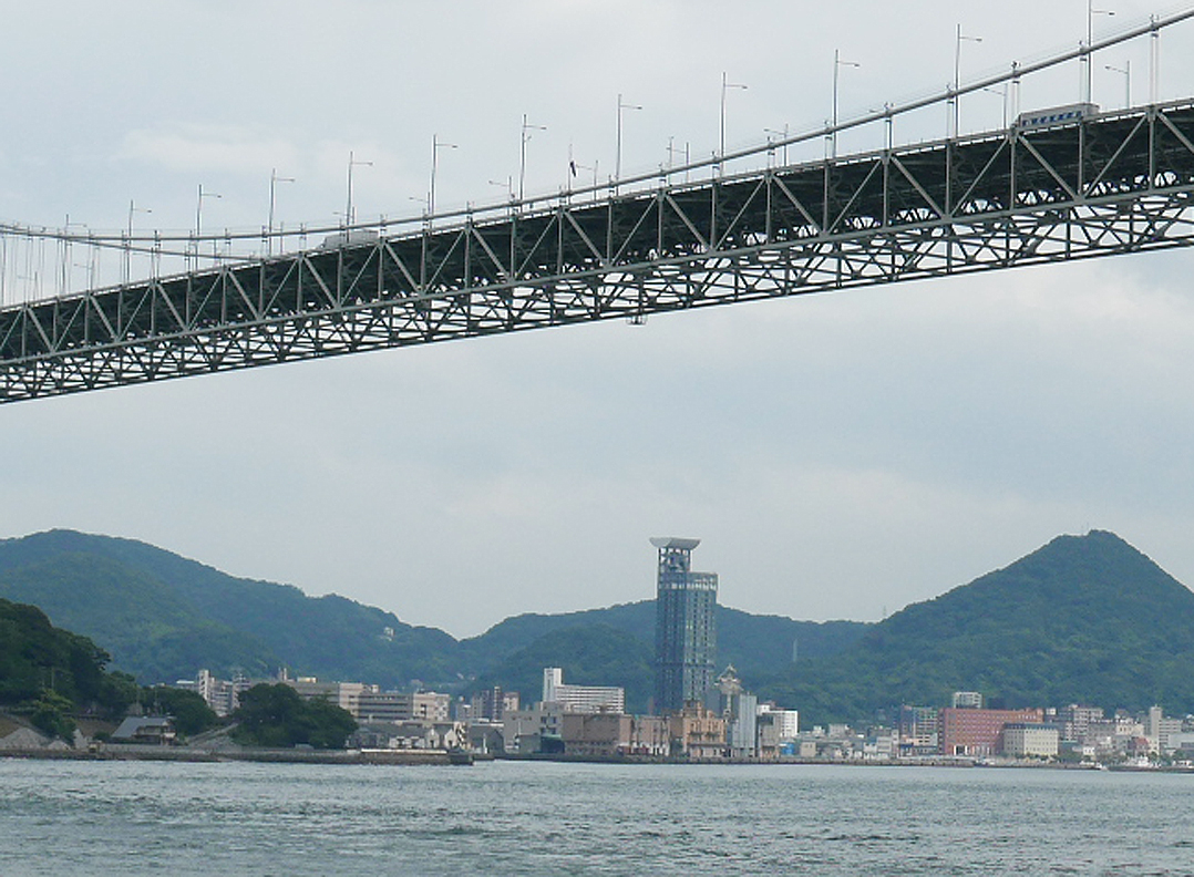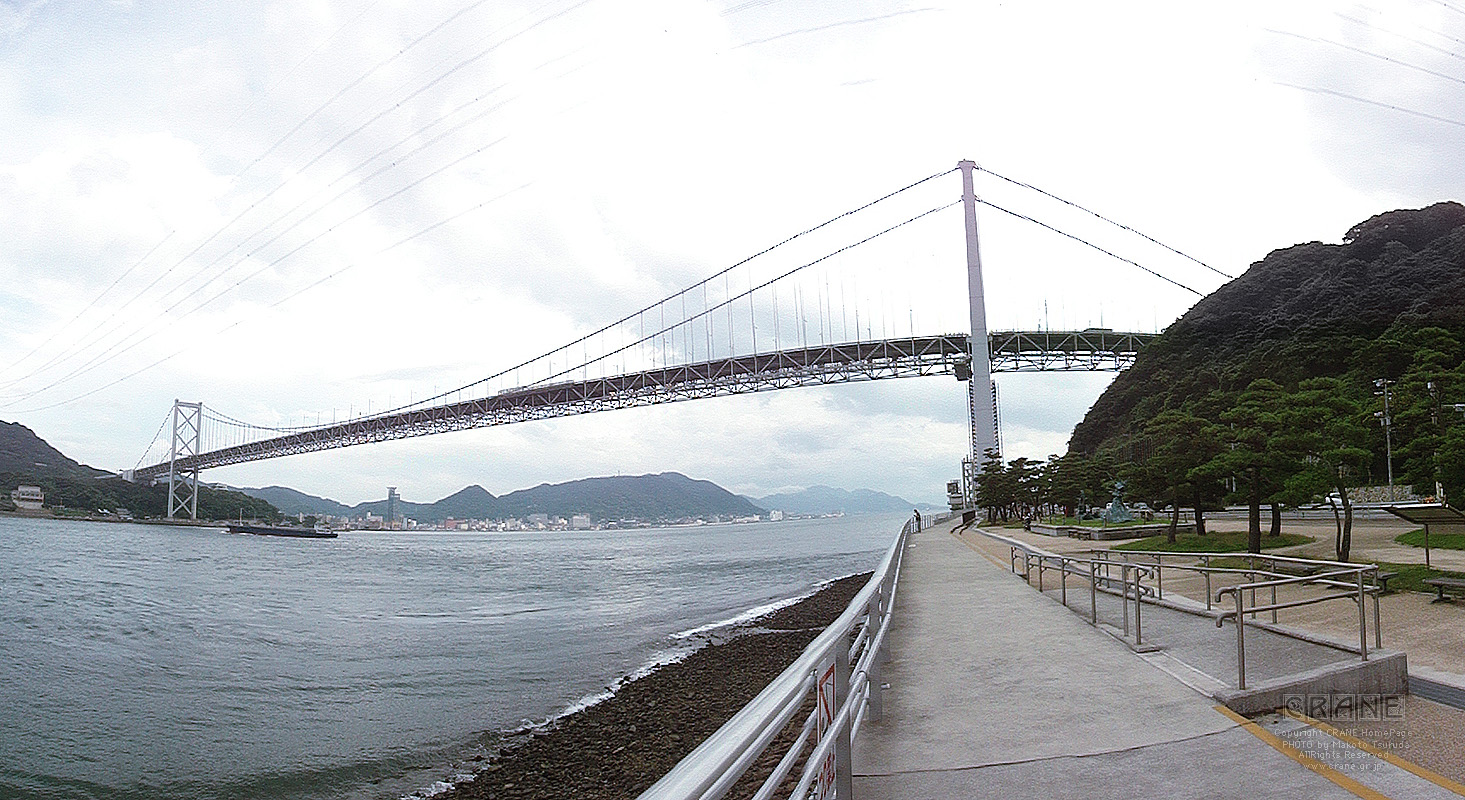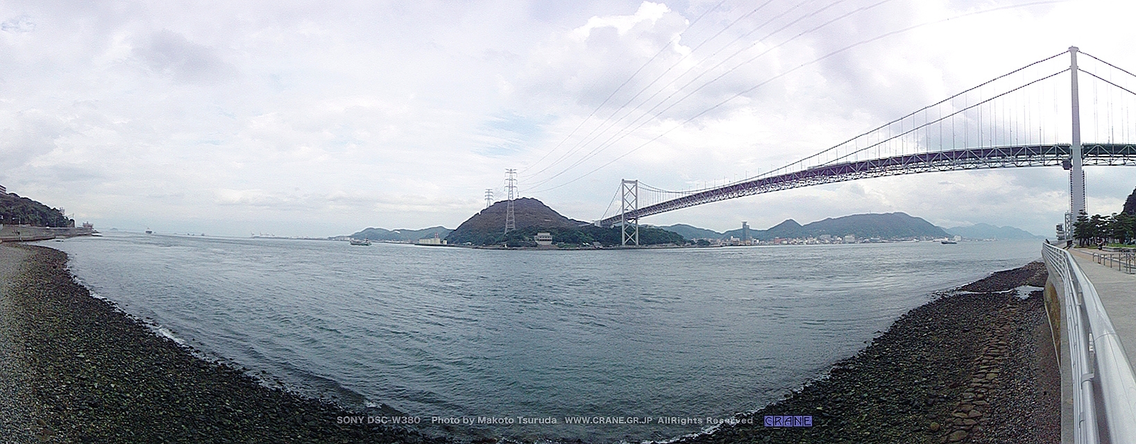 スイング撮影でやっと橋全体が収まりますた。逆光気味なのでパノラマ撮影するとカラーバランスが混在し、古い写真みたいに退色して写ってしまいます。今回の旅のテーマには好都合でレトロですな。中央の奥に巌流島。橋をよく見ると大型トラックが轟音をたてて走っています。高速道路であることがわかります。