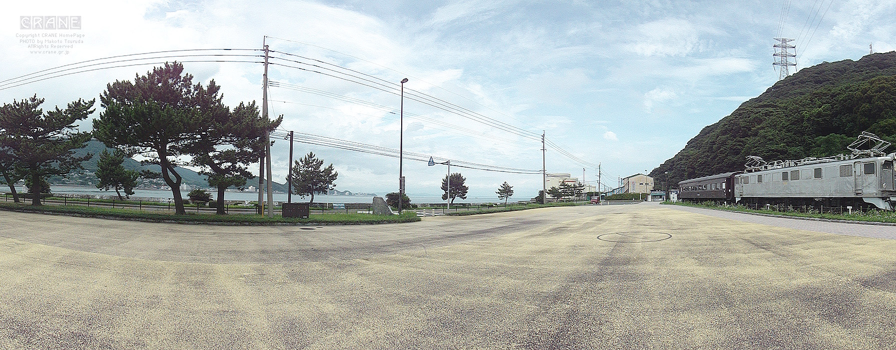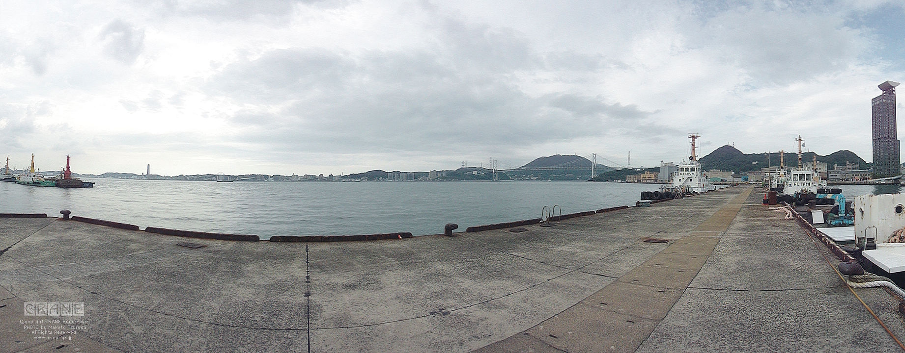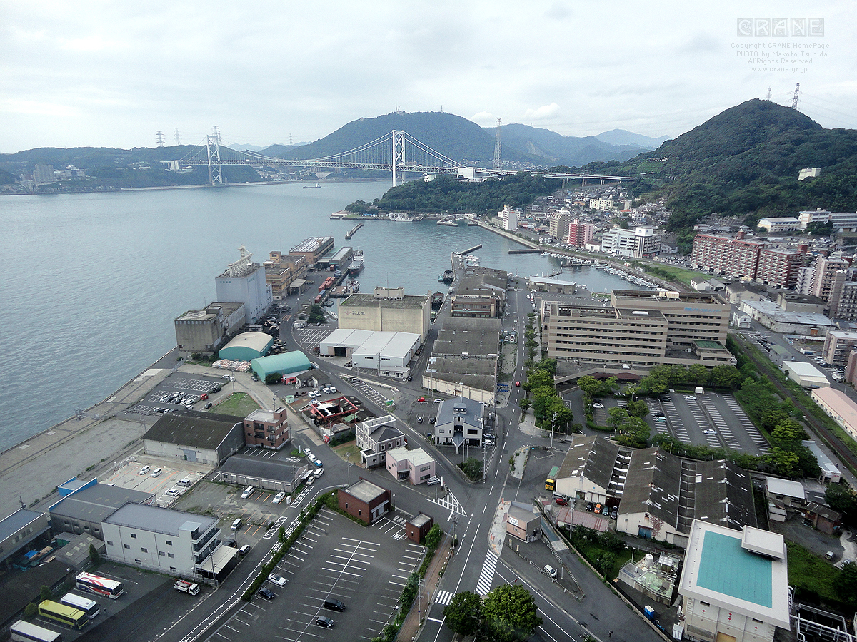 スイング撮影でやっと橋全体が収まりますた。逆光気味なのでパノラマ撮影するとカラーバランスが混在し、古い写真みたいに退色して写ってしまいます。今回の旅のテーマには好都合でレトロですな。中央の奥に巌流島。橋をよく見ると大型トラックが轟音をたてて走っています。高速道路であることがわかります。