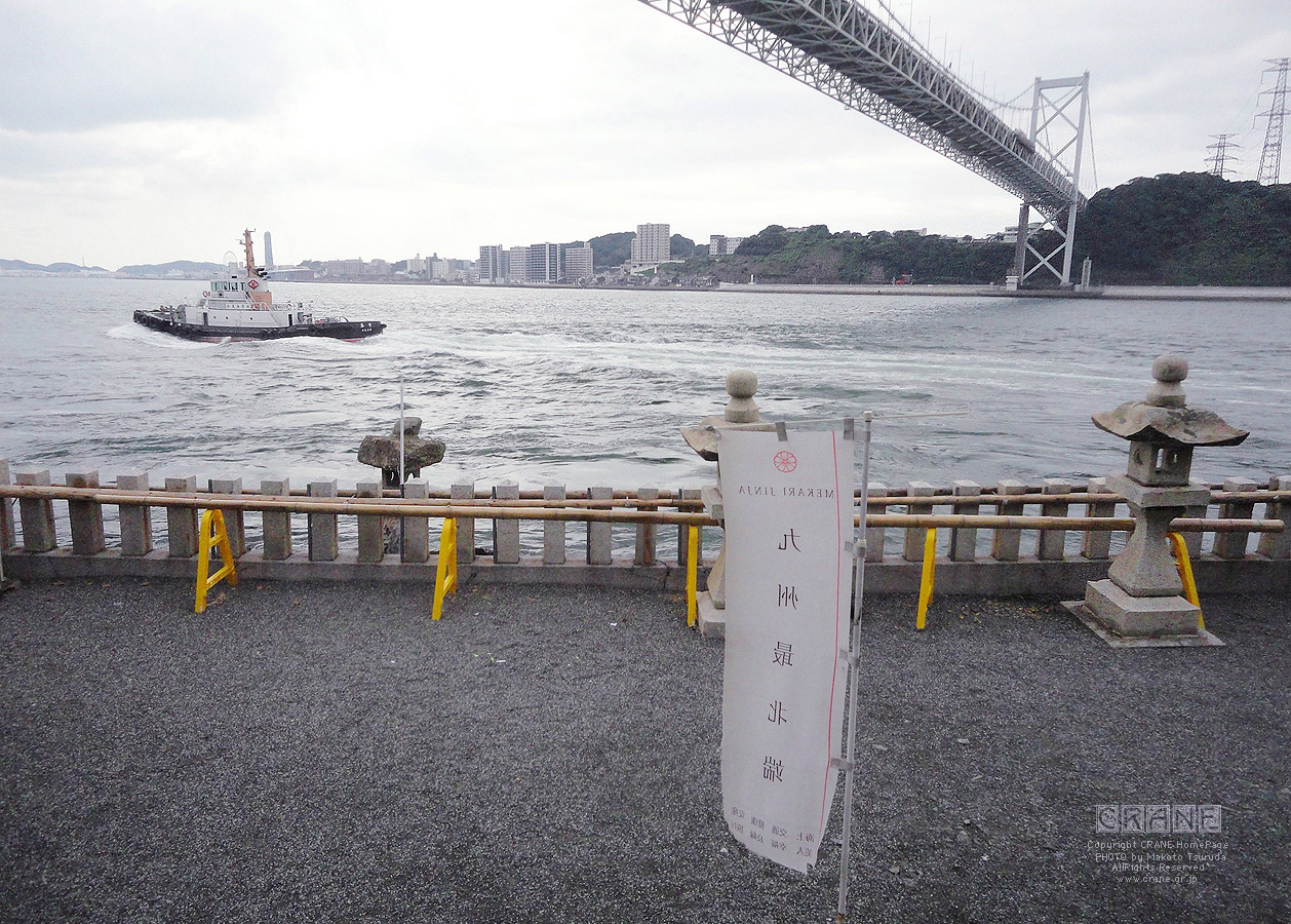 写真3:北側です。対岸は山口県と関門橋。トロッコ列車は右手から上に線路が延び、港沿いを走ってトンネルを抜けて和布刈へ。