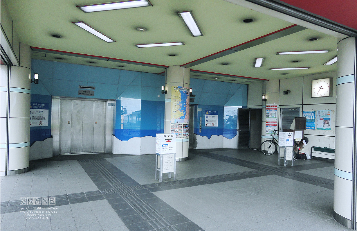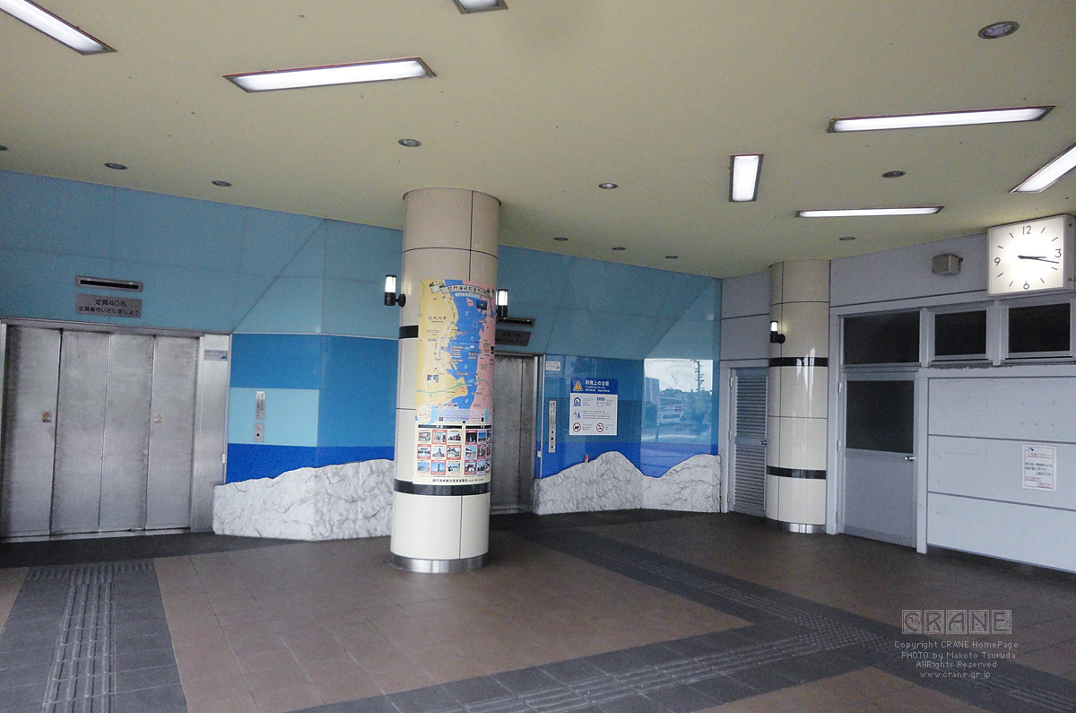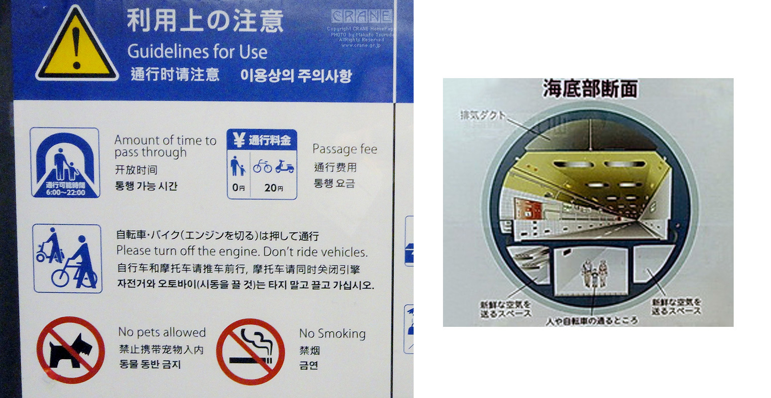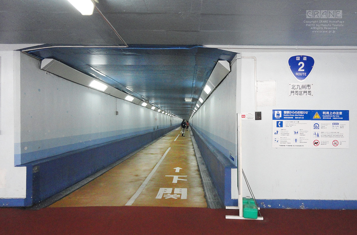 はい!もう着きました。ここが人道入り口です。ちなみにこれもれっきとした「国道」なんです。一つのトンネルが上下に区切ってあって頭上には車が走ってます(国道2号線は二段構えなのだ)。高速道路はさっきの巨大な橋ですが、一般道は海底というわけです。