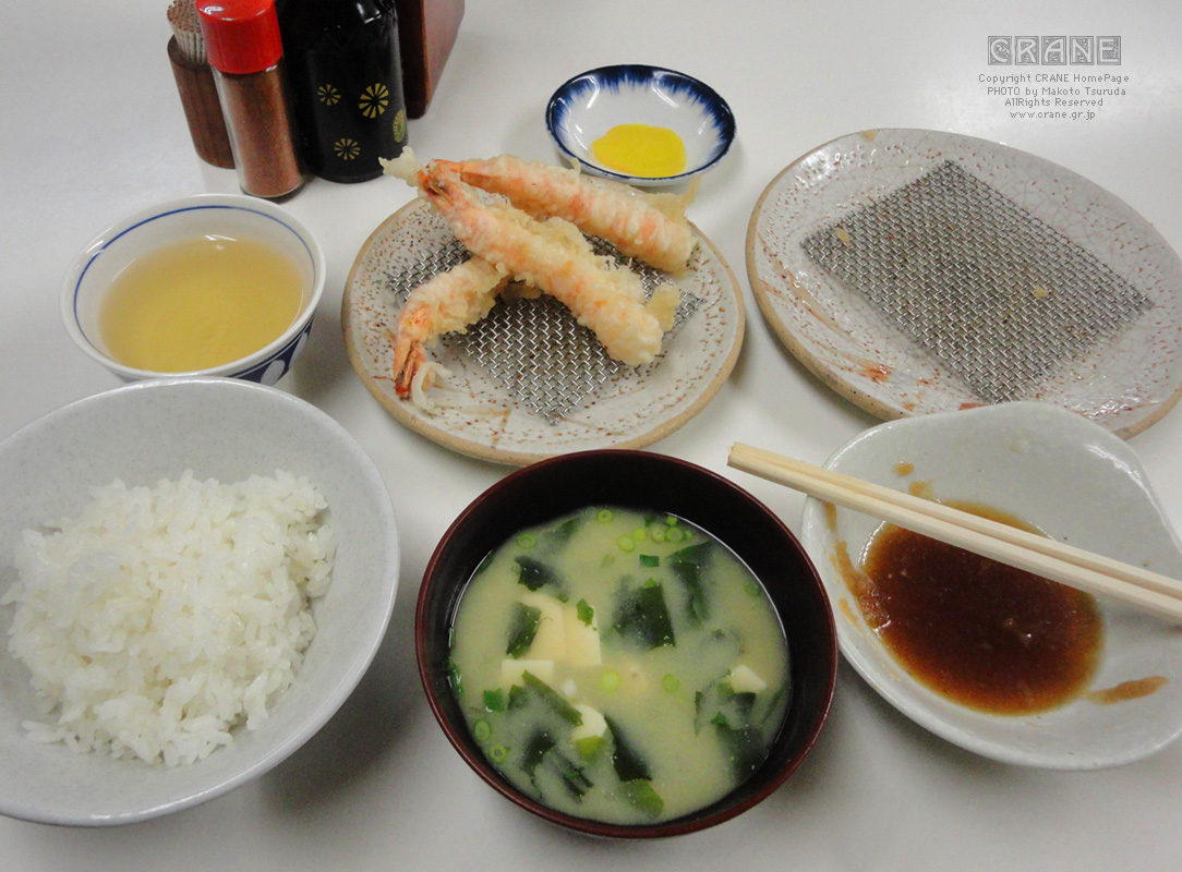 札を席に置いてしばらくすると出てきます。白ダシの味噌汁が美味しい(懐かしい)。トッピングのくじら天は半生だったけど、野菜天やキス天、美味しかったです。そういえば食事の写真を最初に撮り損ね、追加のエビ天3本の写真となりにけり(基本は前払いですが現金で追加注文可能です)。「追加でエビ天3本!」というと周囲のお客さんたちが箸を止めて、はっ!とします。隣のじいさんは「こやつ、できる!」という表情で見ています。いや、店内の壁に書いてあるんですけどね。追加注文は現金でと(3カ所ぐらいに貼紙)。エビ天また食べたいなぁ ... 。