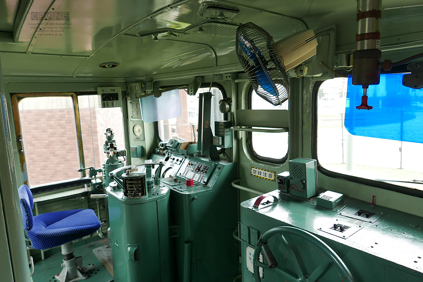 この3つの車両は裏手から運転席に入ることができます(扇風機は形状からみて間違い無く松下製)。赤い車両の運転席はミニ階段で登る構造です(すごく狭い)。小倉で機関士をしていた叔父いわく、蒸気機関車の時代は機関車を動かすために高度な技術を必要としていたけれど、電化になってからはずいぶんと運転が楽になったのだと。
