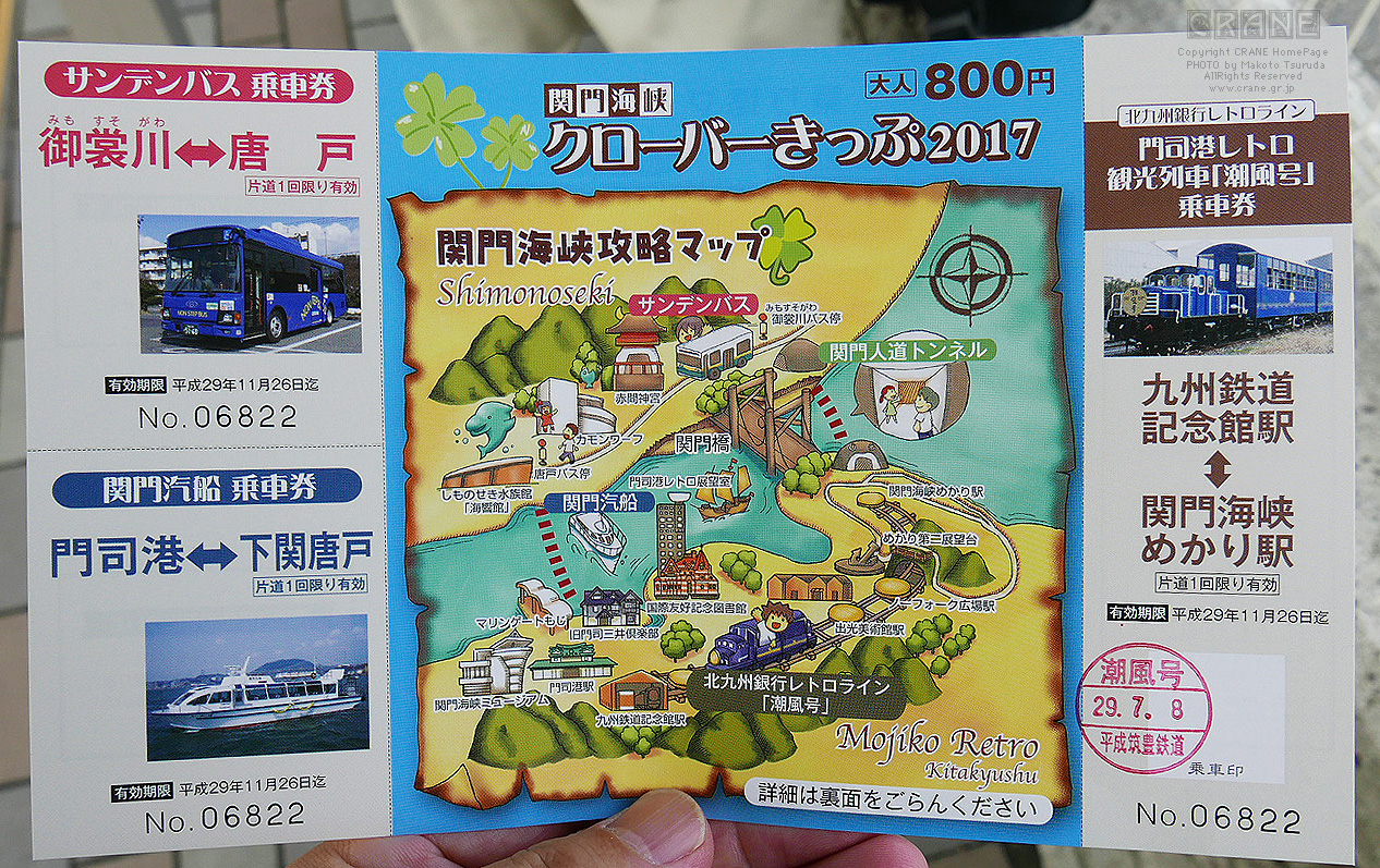 九州から本州へ渡ってまた本州へ戻ってくるという、そんなお客さんが多いらしく、トロッコ列車乗り場で周遊券「関門海峡クローバー切符」が売っていました。これが無くてもそのつど交通費を払えばいいのだから要らないなぁ、とブツブツ言いながら、予定どおり周遊券を購入します。そもそも周遊券と書いてはありますが一言も「お得」とは書いてありません。いいんです。この周遊券を買うこと自体がイベントなのですから。